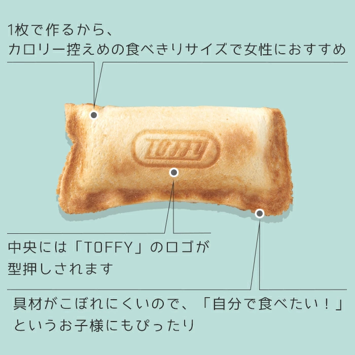 Toffy K-HS3の魅力のひとつが、「ハーフホットサンド」専用サイズであること。食パン1枚をパタンと折りたたんで作るので、ちょうどいい“食べきりサイズ”のホットサンドが楽しめます。朝食は軽めでいいという方や、小腹が空いたときのおやつにもちょうどいいボリューム感です。